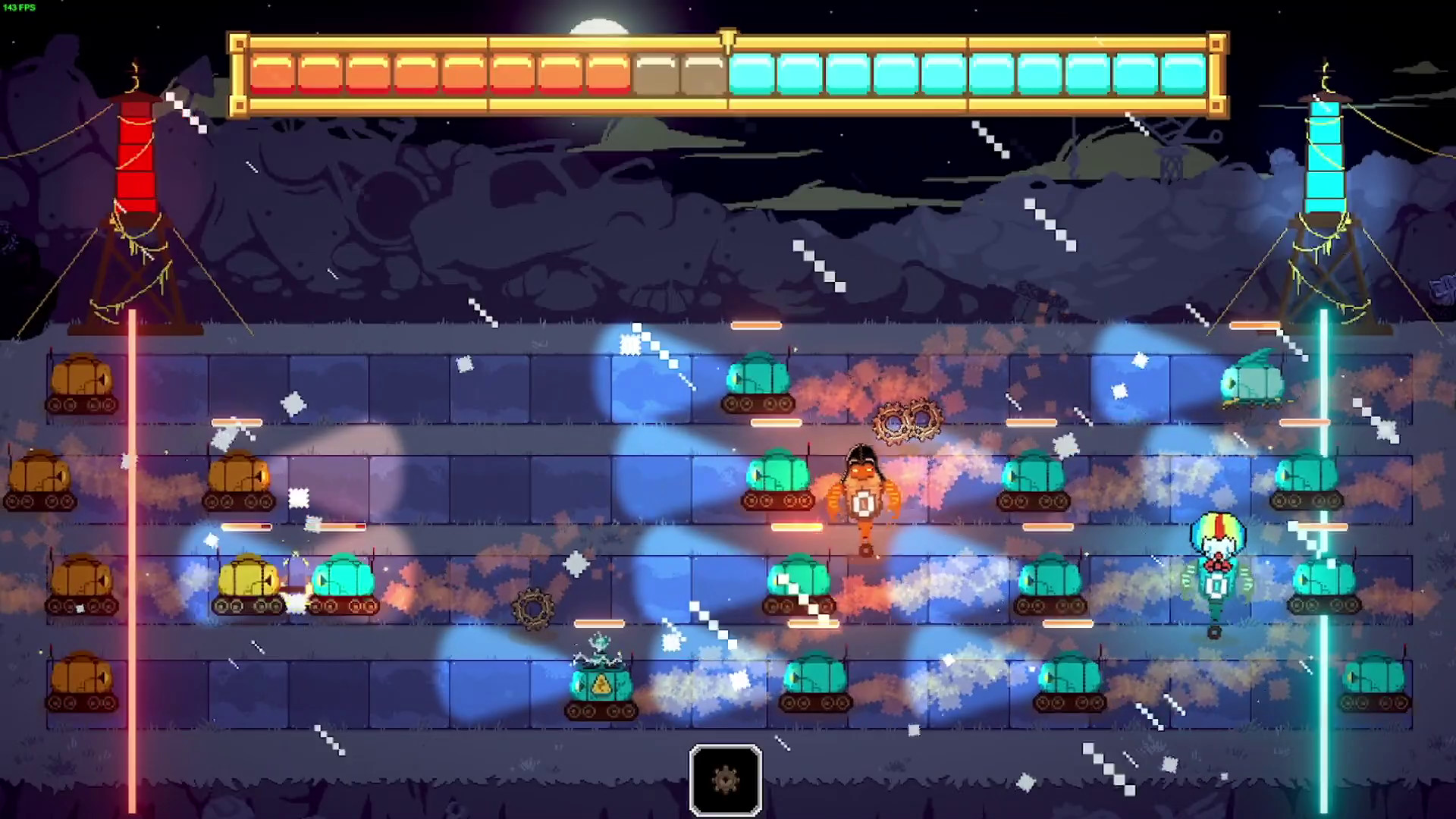 Scrapshoot is a local multiplayer couch arena battler where you battle it out in the junkyard. Players collect scrap as it falls from the sky and give it to bots on their side of the field. Most scrap is normal and just helps to repair the bots, but some of the items falling from the sky are special, and will power up your bots. Send your bots down the line until you break your enemy’s barricade and achieve victory.